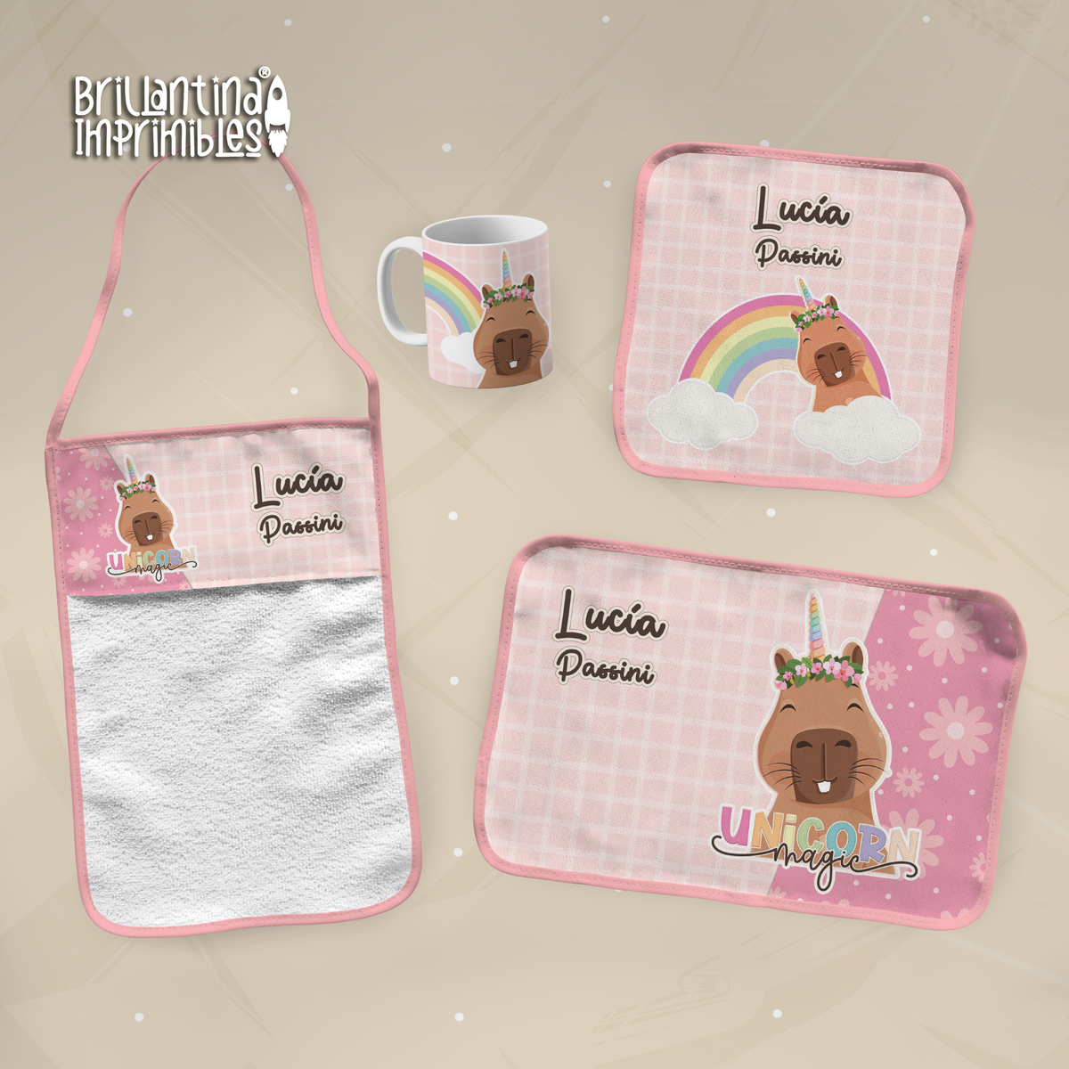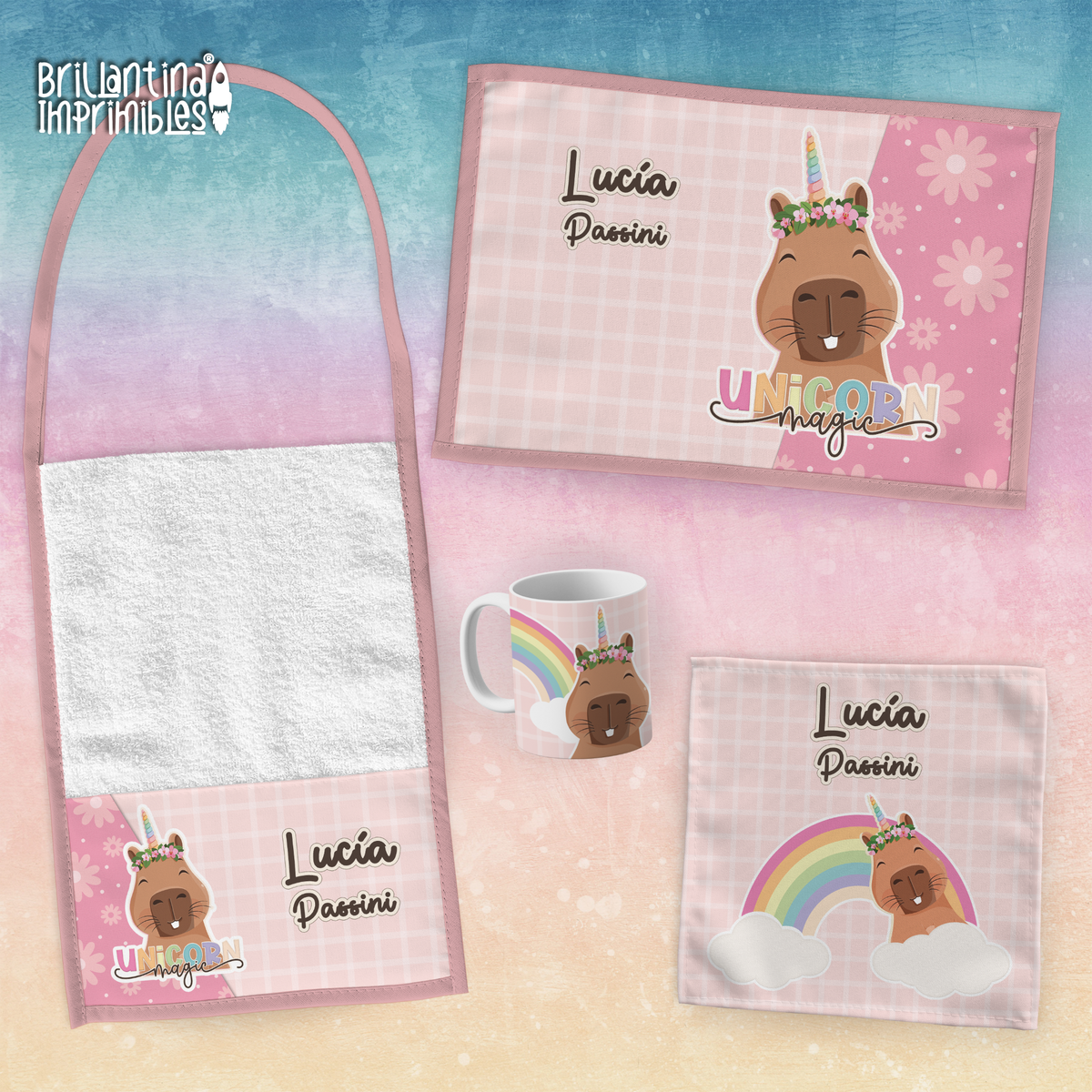 Algunos de los productos tienen incorporado el logo o web de Brillantina Imprimibles en algún lugar del diseño.